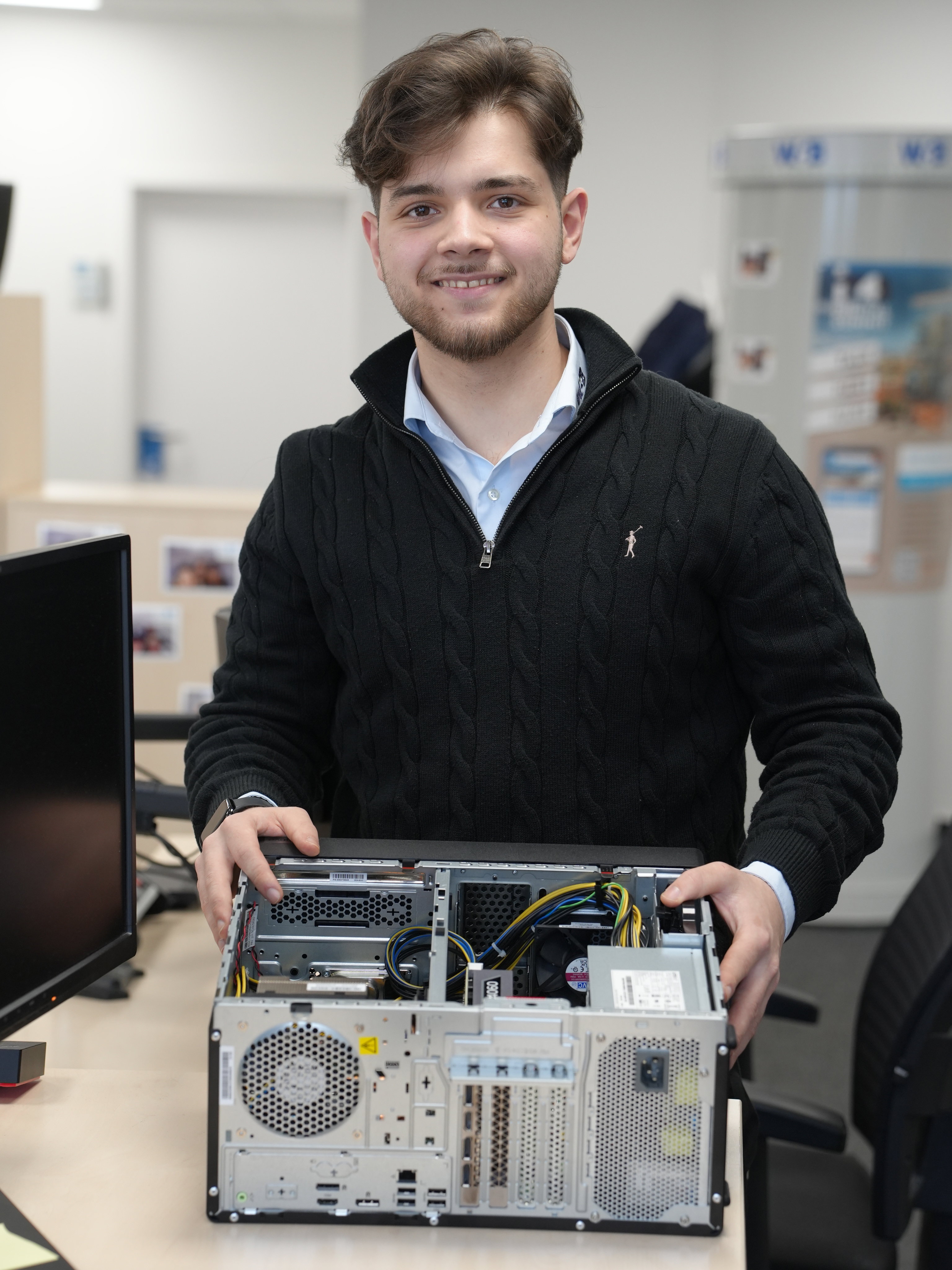 „Als Ausbildungsbotschafter engagiere ich mich, um Schülerinnen und Schülern einen realistischen und praxisnahen Einblick in die berufliche Ausbildung zu geben. Technik, Teamarbeit und echter Arbeitsalltag: In meinem Ausbildungsbetrieb erlebe ich echte Mitarbeit im Unternehmensalltag – und lerne so täglich dazu. Ich absolviere eine Ausbildung zum Fachinformatiker für Systemintegration, da ich Interesse an moderner IT habe und diese bei Kunden etabliere, um ihr Unternehmen technisch auf den neuesten Stand zu bringen.“
